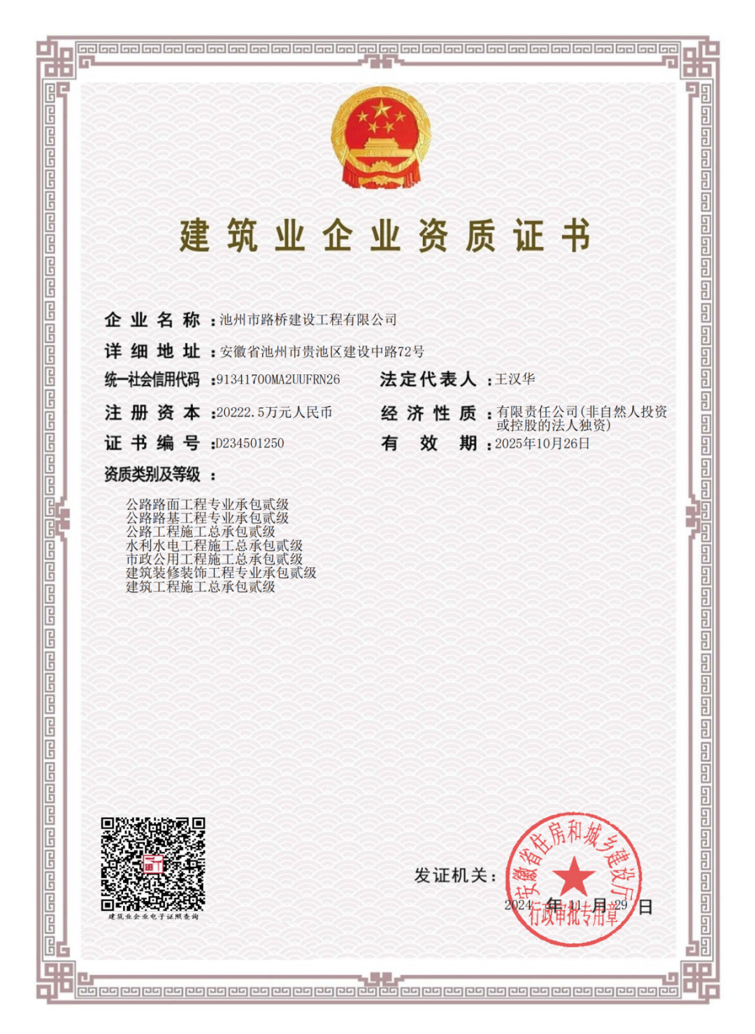 池州市路橋建設(shè)工程有限公司獲批水利水電工程施工總承包資質(zhì)貳級(jí)