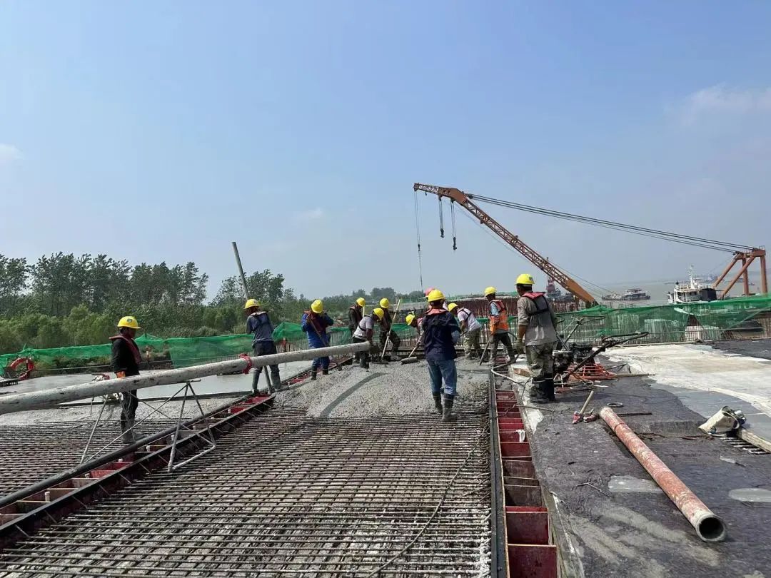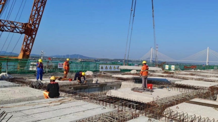 前期工作已完成,PHC管樁及鋼管樁已施工完成,引橋灌注樁施工124根,完成總量的97%,下橫梁施工完成,預(yù)制梁安裝完成84%,預(yù)制板安裝完成70%,上橫梁施工完成61%,現(xiàn)澆面層完成7%,水下拋石完成41%。