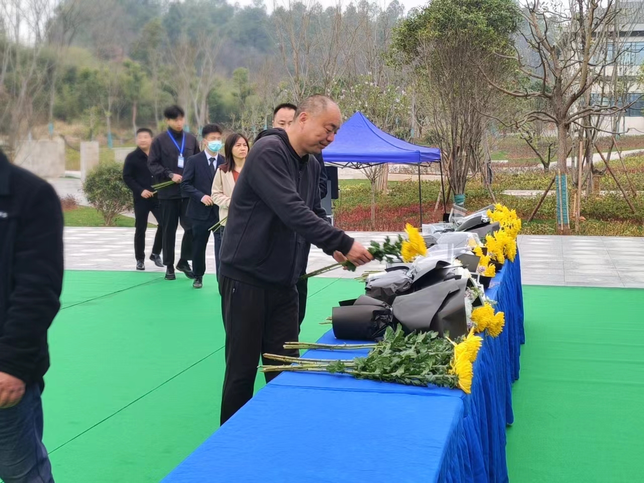 上午9時(shí),集體公祭活動(dòng)正式開(kāi)始。現(xiàn)場(chǎng)樂(lè)聲低徊,莊重簡(jiǎn)樸,參加儀式人員身著深色服飾,在展臺(tái)處莊嚴(yán)肅立。在集體公祭環(huán)節(jié),全體人員集體默哀,隨后手持鮮花拾階而上敬獻(xiàn)祈愿,面向公墓行鞠躬禮,表達(dá)對(duì)逝去人的追憶和緬懷。
