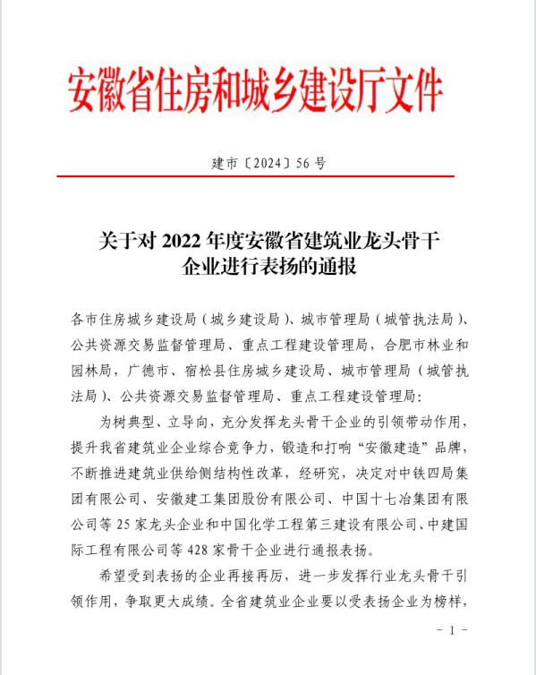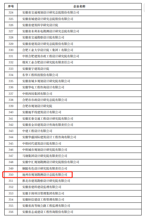 4月10日,安徽省住房和城鄉(xiāng)建設(shè)廳發(fā)布了《關(guān)于對2022年度安徽省建筑業(yè)龍頭骨干企業(yè)進(jìn)行表揚的通報》,集團所屬池州市規(guī)劃勘測設(shè)計總院有限公司榮登榜單。
